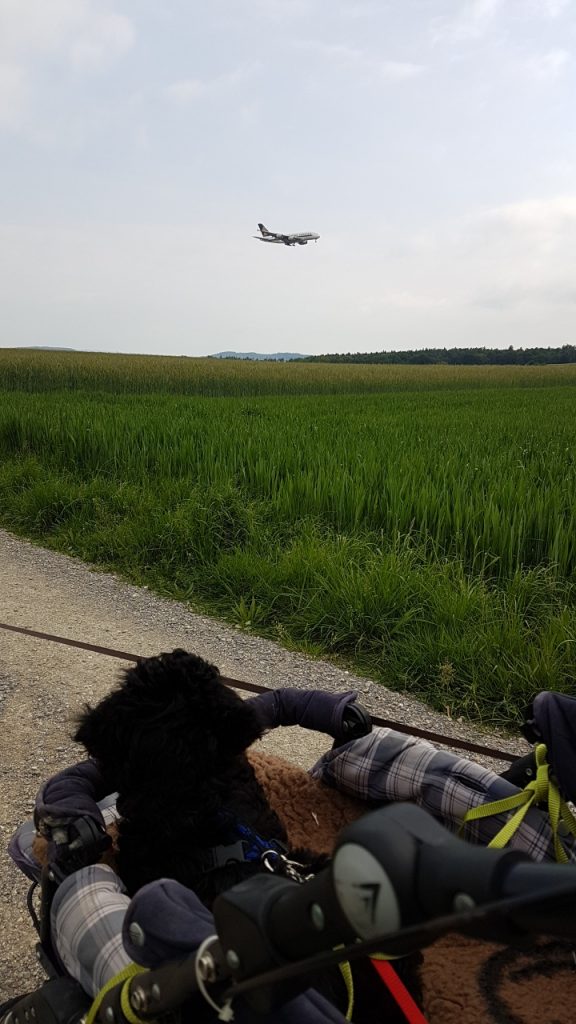 Den ersten Spaziergang mit den Großen hat sie weitgehend in einer Tasche verbracht, danach aber durfte sie im Kinderwagen mit Knabberli mit auf den großen Spaziergang. Es hat ihr offenbar gut gefallen. Sie war ganz entspannt und hat die grossen „Vögel“ am Himmel bestaunt.