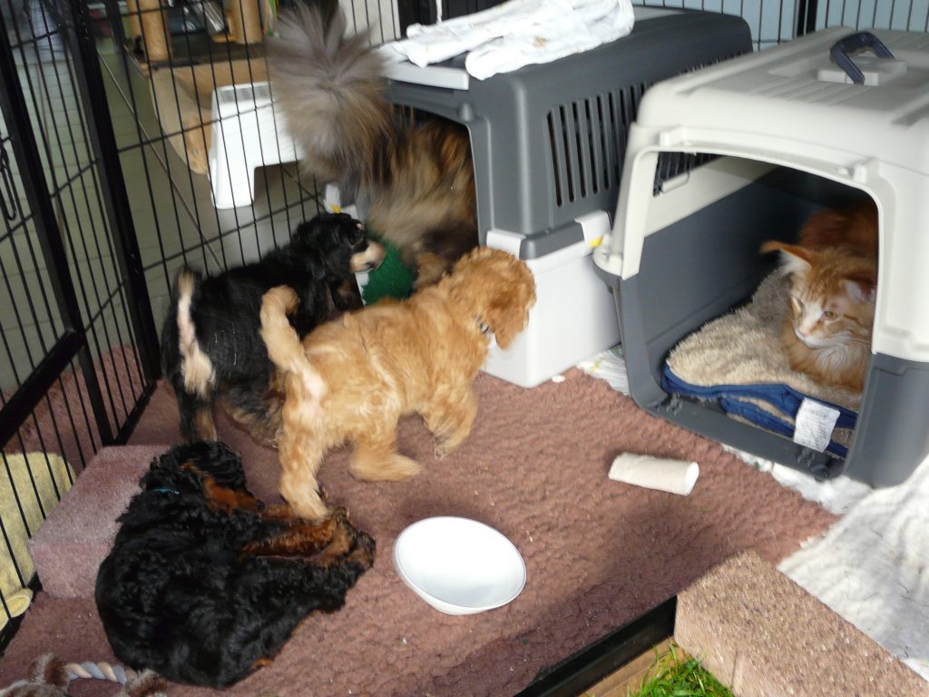 Im Haus waren die Boxen eigentlich dazu gedacht, die Welpen schon mal daran zu gewöhnen. Unsere Katzen sehen das anders…