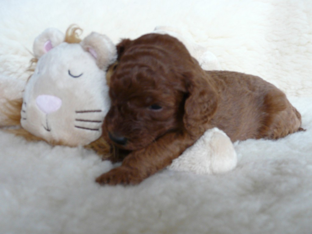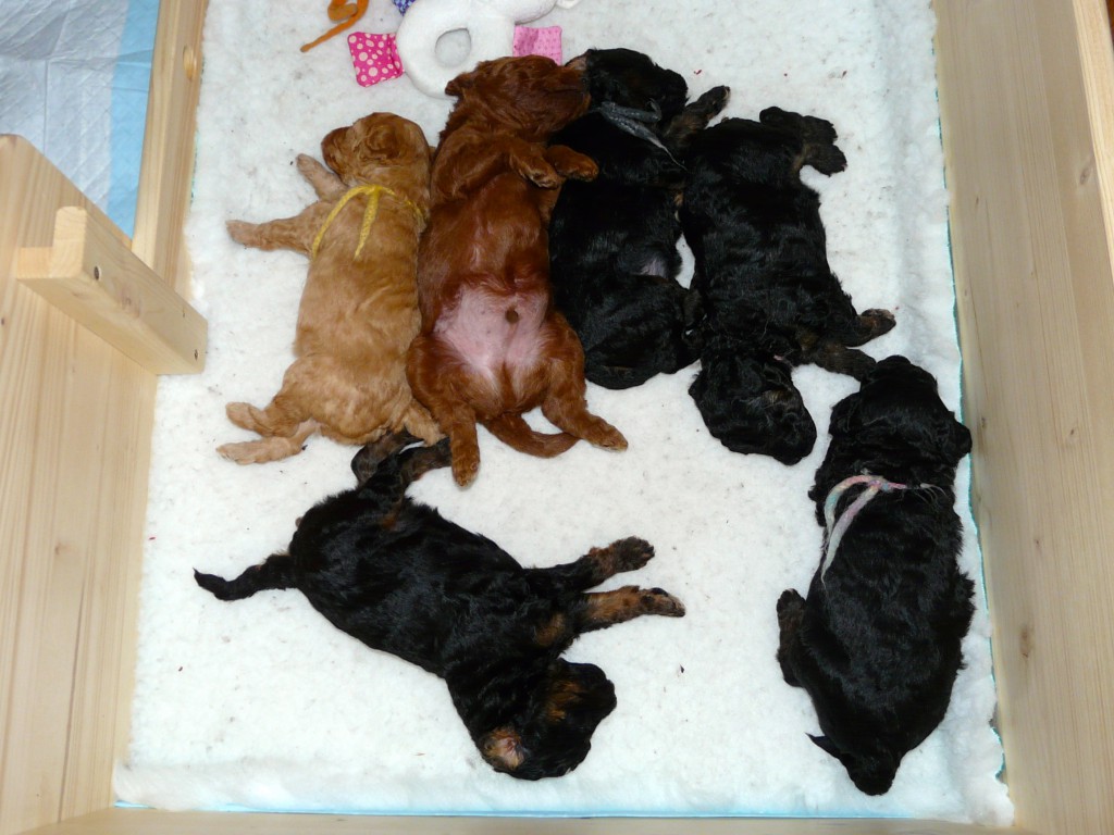 Dennoch verschlafen die Kleinen den allergrößten Teil des Tages. Weil sie aber inzwischen allein pinkeln können, wurde die Wurfkiste umstrukturiert: Es gibt jetzt einen Kuschelbereich mit Decke und den Pinkelplatz Richtung Ausgang, wo sich tatsächlich vermehrt Pfützen sammeln.
